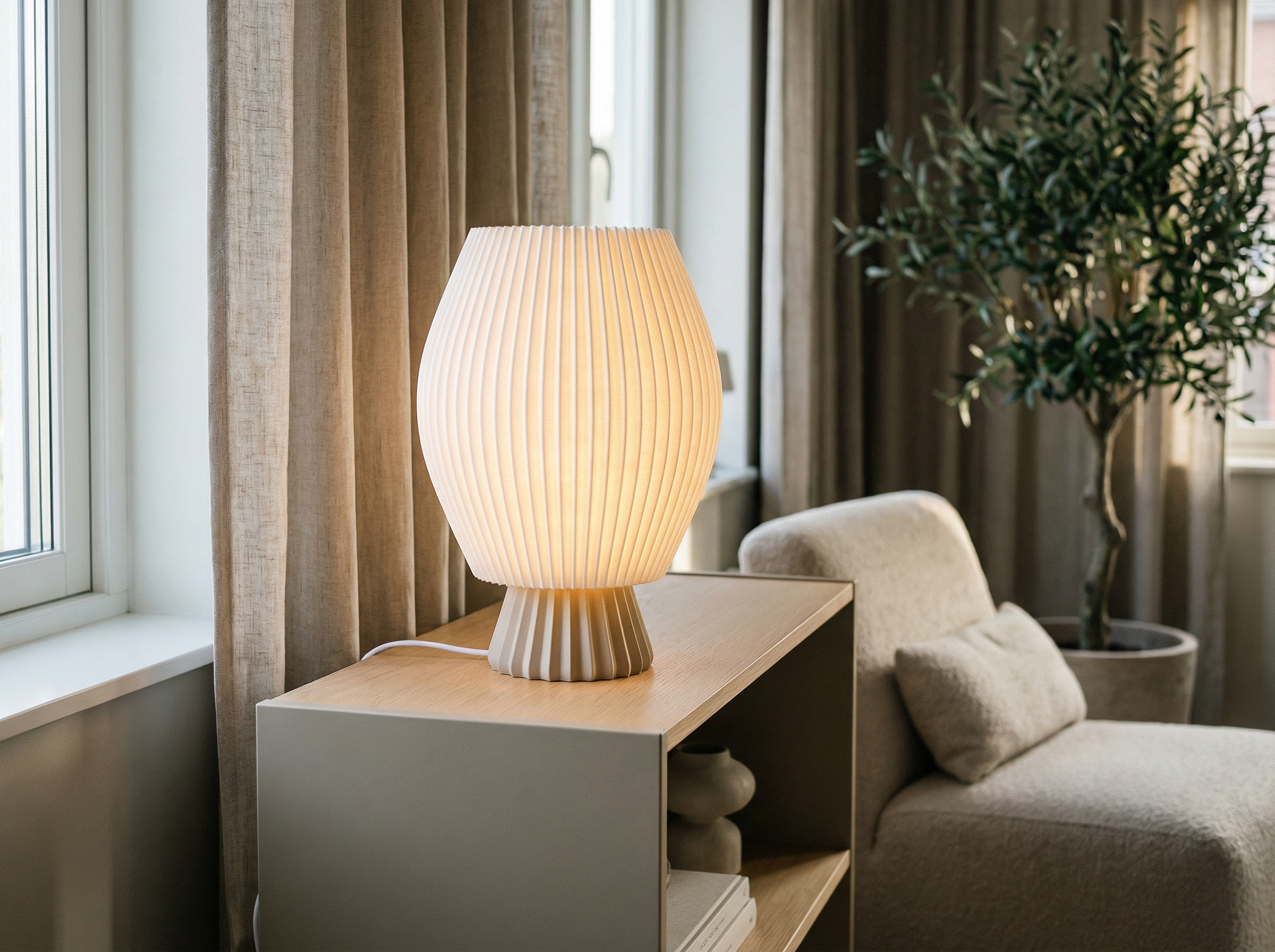 Fabriquée à la commande à partir d’un bioplastique d’origine végétale, elle associe précision des formes et légèreté maîtrisée, pour s’intégrer naturellement dans des intérieurs contemporains.